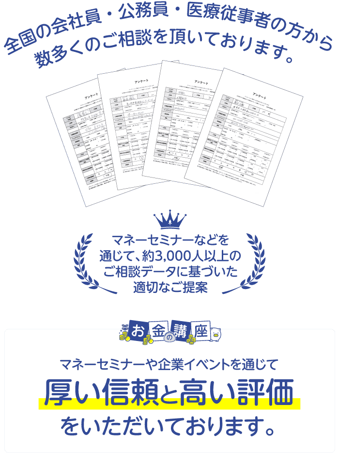 お金の講座は専属FPと投資のプロがライフプラン改善から資産防衛、資産形成、解説から質疑応答まで無料で何度でも相談可能なオンラインセミナーです。