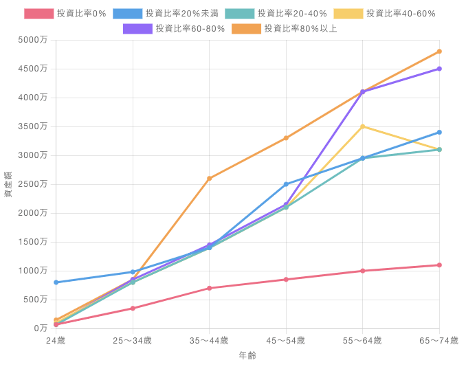 投資をしていない人に比べて、投資をしている人の方が年齢とともに資産額の傾きが右肩上がりになっています。